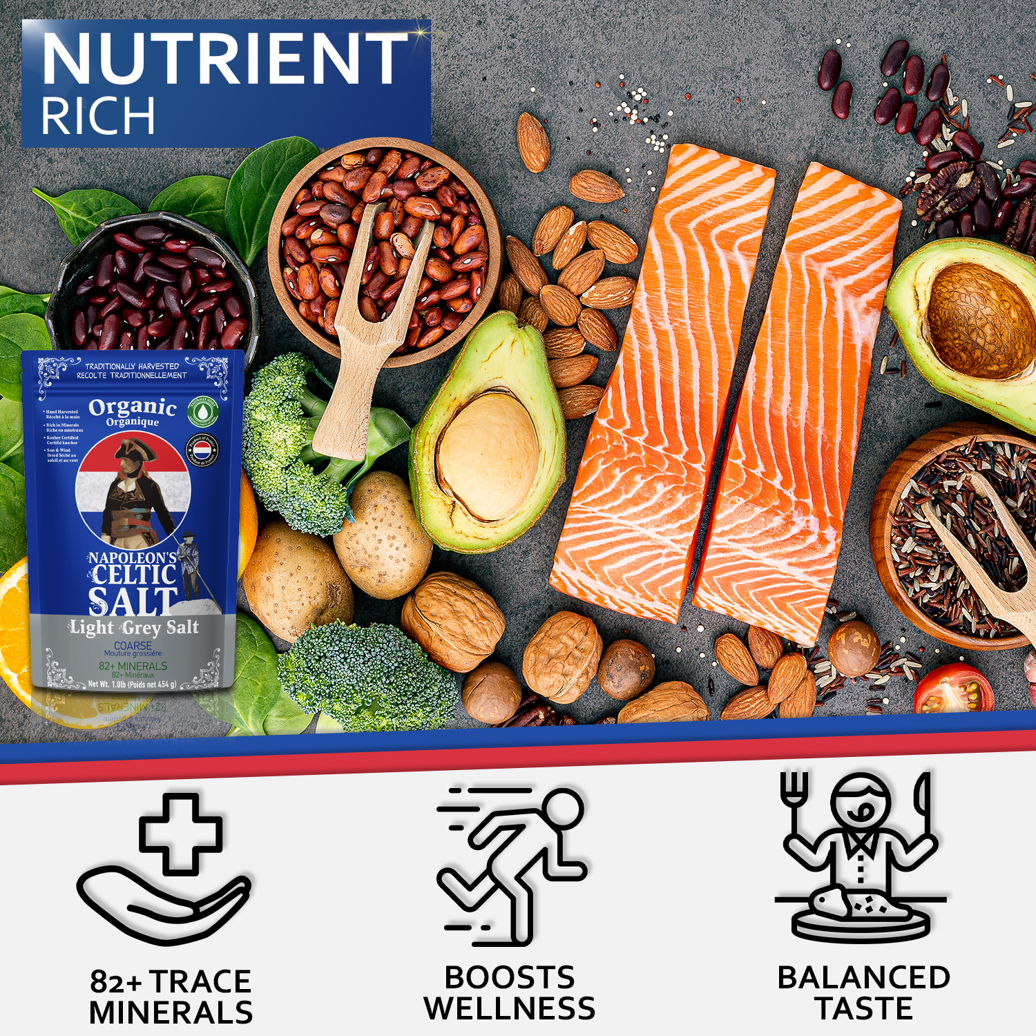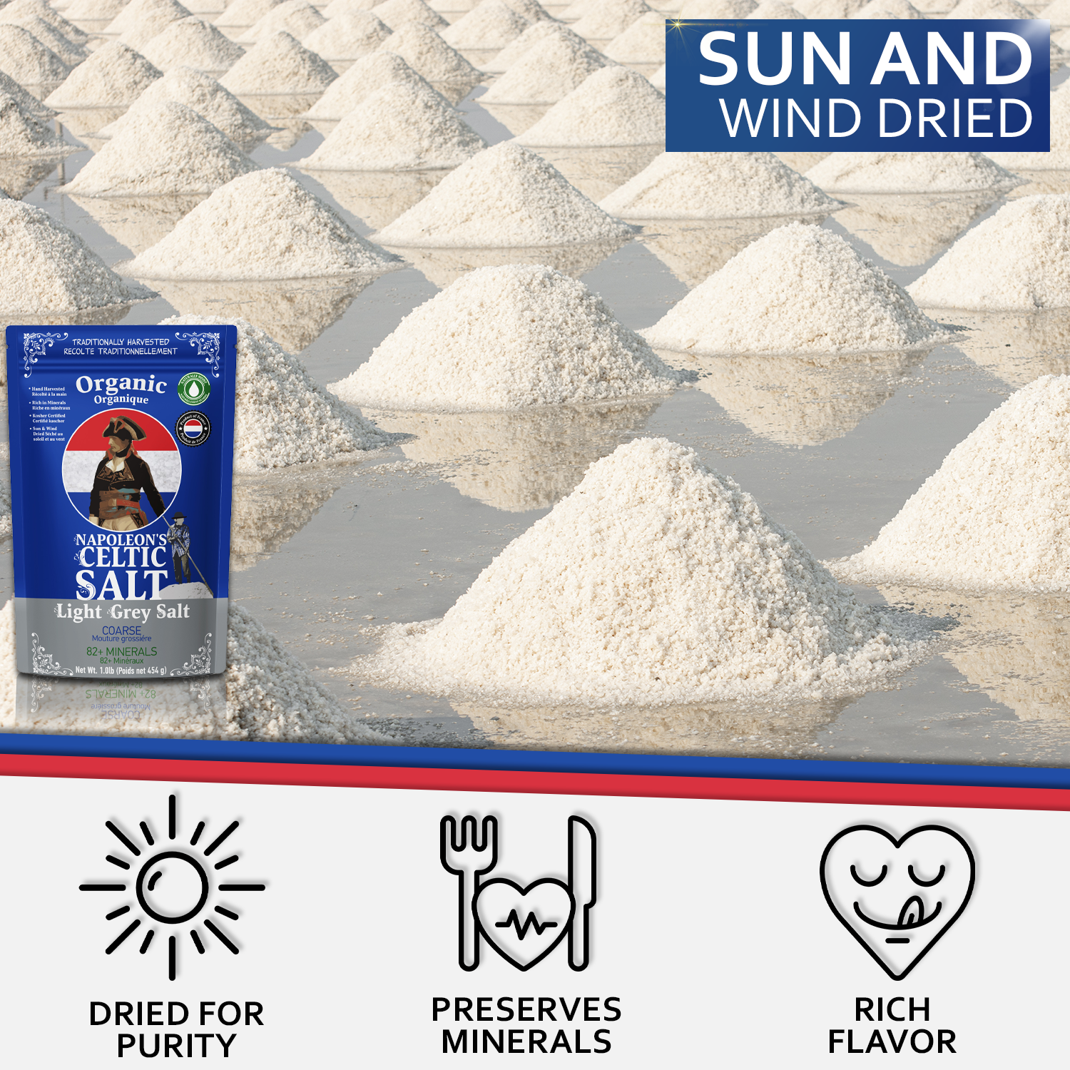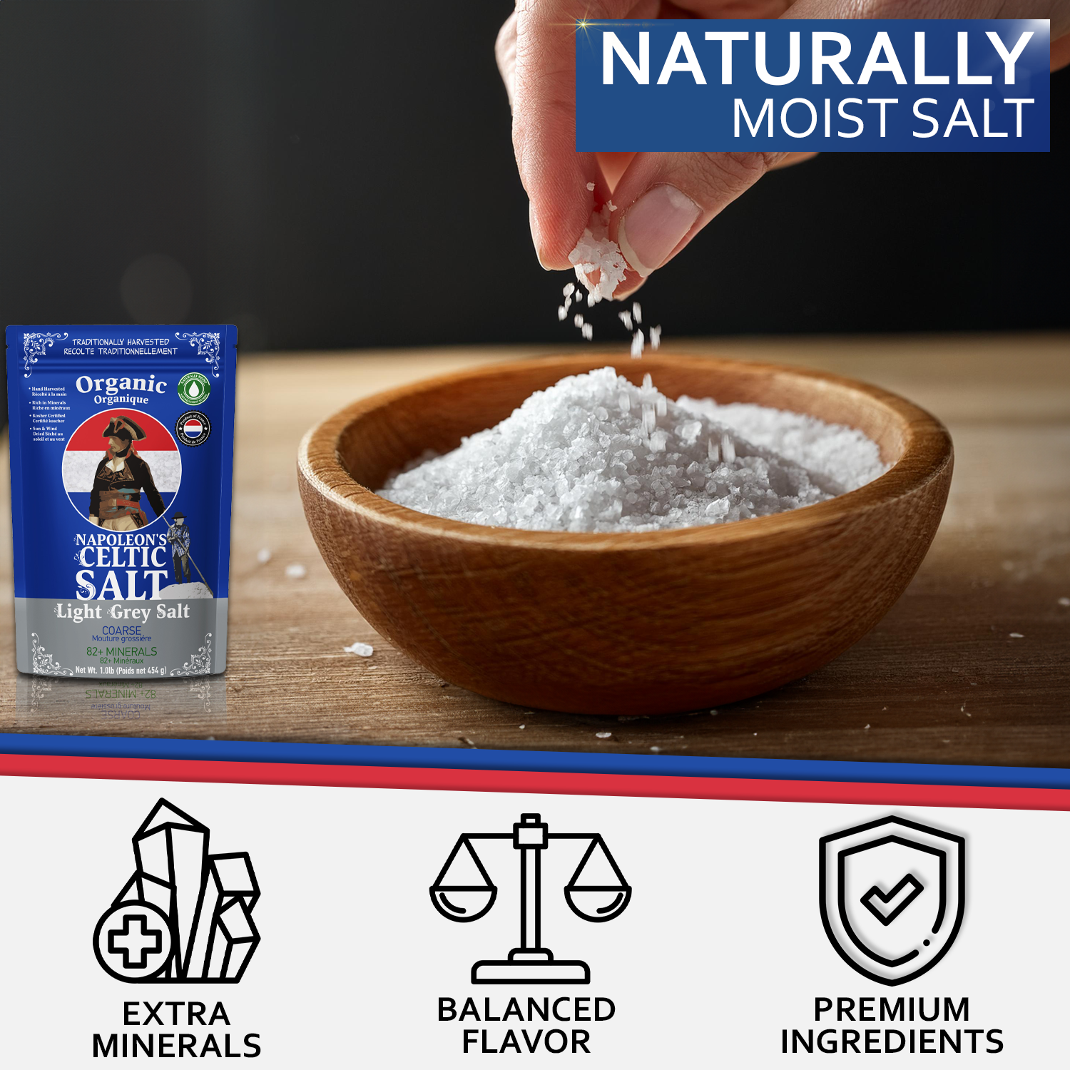 Premium Celtic Grey Sea Salt (1lb) - Hand-Harvested French Artisanal Salt with 82+ Minerals. Our larger 1lb bag of kosher-certified, organic finishing salt is perfect for dedicated home chefs and cooking enthusiasts. Naturally sun-dried and free from anti-caking agents, this flaky sea salt delivers authentic mineral-rich flavor and delightful texture. Ideal for all culinary applications, from gourmet finishing to everyday cooking and baking.